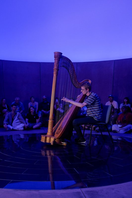 Harpist Stef Van Vynckt performing in James Turrell’s Skyspace C.A.V.U. at MASS MoCA, photo courtesy the artist.