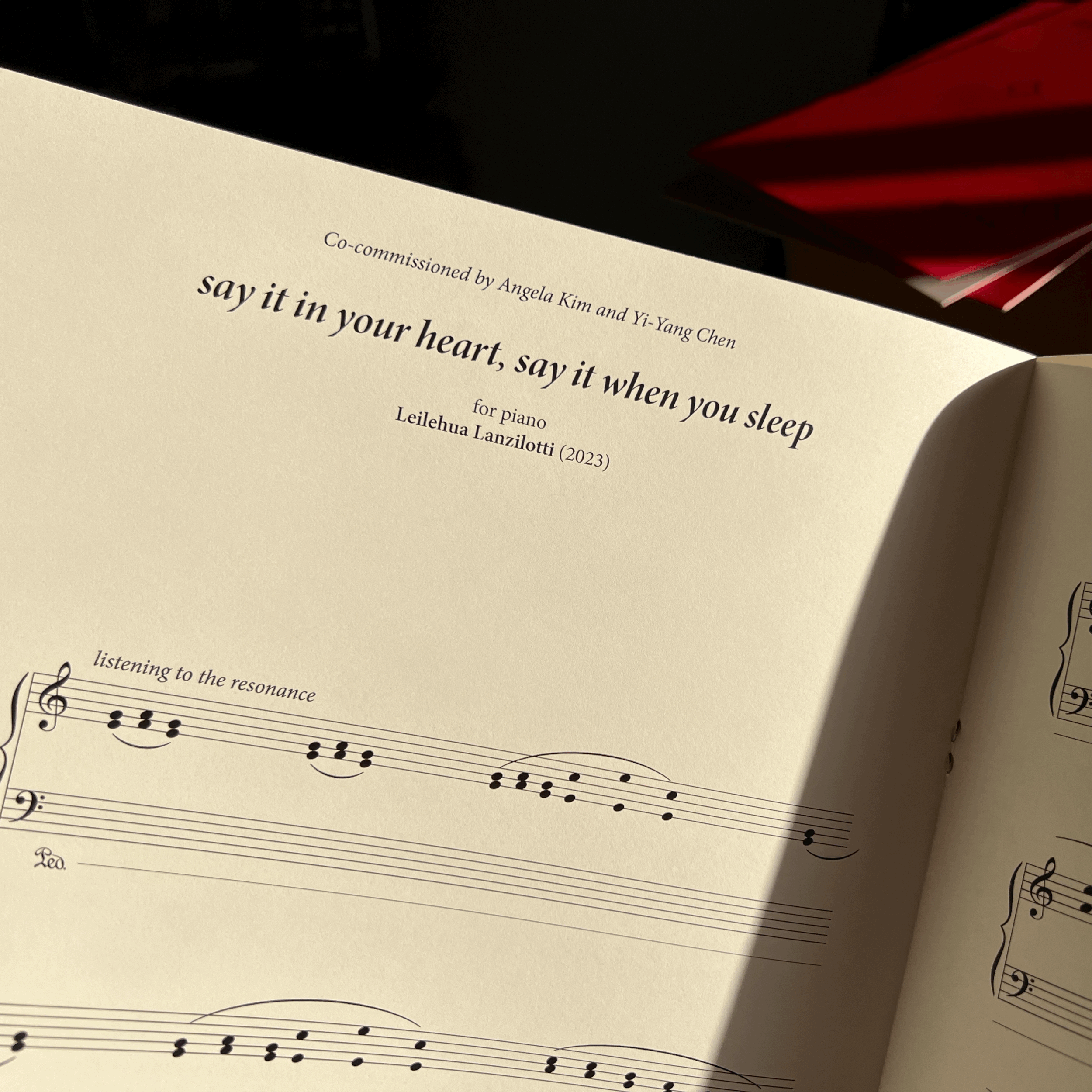 The pitch content in say it in your heart, say it in your sleep is drawn from Lili‘uokalani’s song, E ku‘u Ho‘ōla. “Ho‘ōla” means “to give life, to revive, to heal” in ‘Ōlelo Hawai‘i, while “ea” means “sovereignty” or “life” (EA is a repeated gesture throughout the piece). The title honors scholar and activist Haunani Kay Trask, and is a quote from her most famous speech.